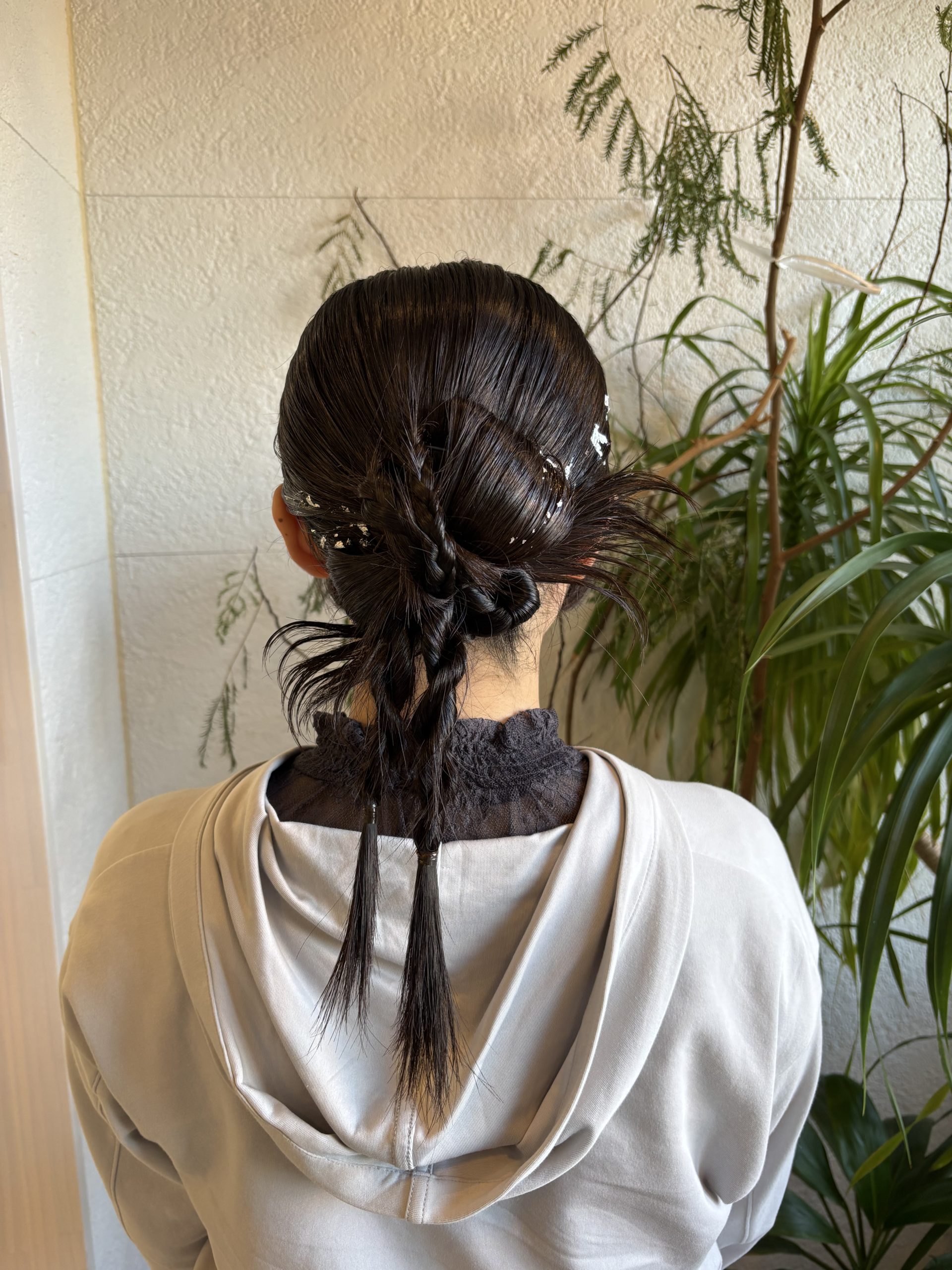 つや感をしっかり出したタイトなまとめ髪に、あえて毛先を残すことで抜け感が生まれます!