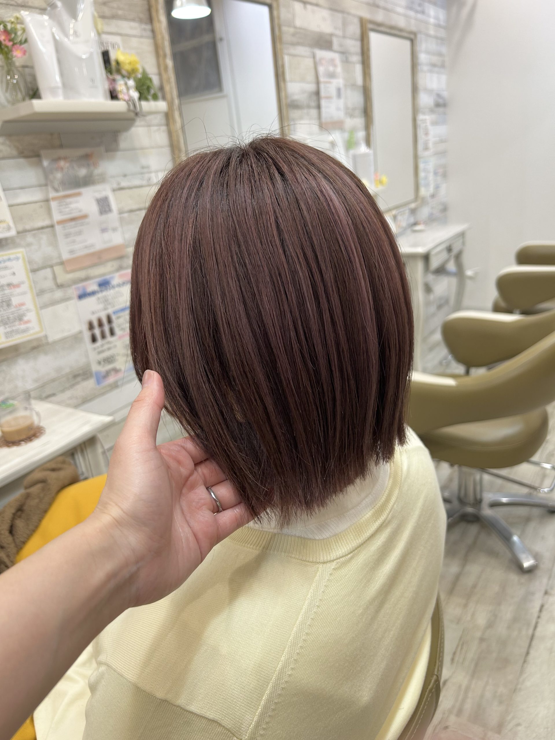 今回のスタイルは、丸みのあるシルエットのボブに合わせてカラーを入れることで、柔らかく女性らしい印象に。光に当たると透けるような透明感が出て、重く見えがちなボブスタイルでも軽やかに見せてくれます。