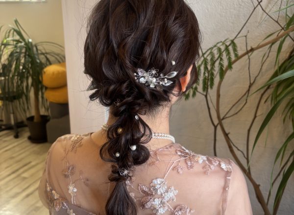他の方と被らないよう、髪の長さとドレスに合わせて